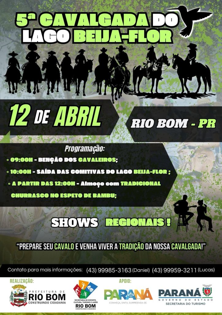 A Prefeitura de Rio Bom, por meio da Secretaria Municipal de Esporte, Cultura, Turismo e Lazer, promove no próximo dia 12 de abril a 4ª Cavalgada do Lago Beija-Flor, evento que já se tornou tradição no município e que celebra a cultura sertaneja e as raízes do campo.